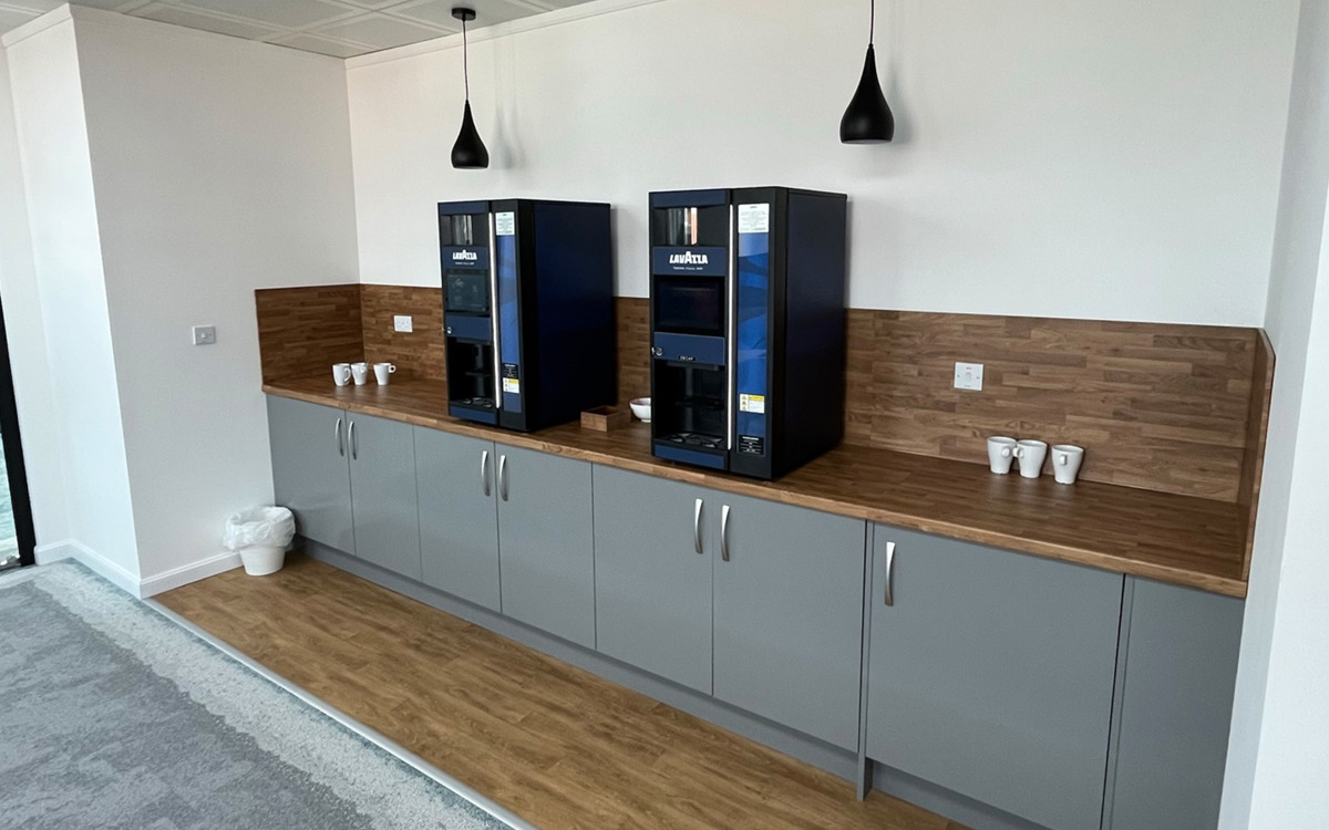 Adjacent to Jura is the breakout area where delegates can relax before, during or after a meeting, grab a coffee from our 2 x Lavazza bean-to-cup coffee machines featuring a fully fitted kitchen with a fridge and access to a cloakroom to store jackets and bags.