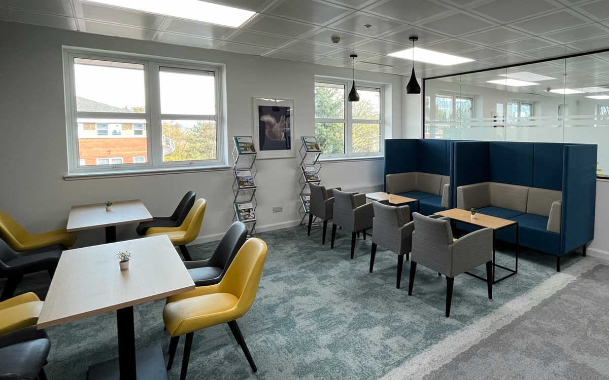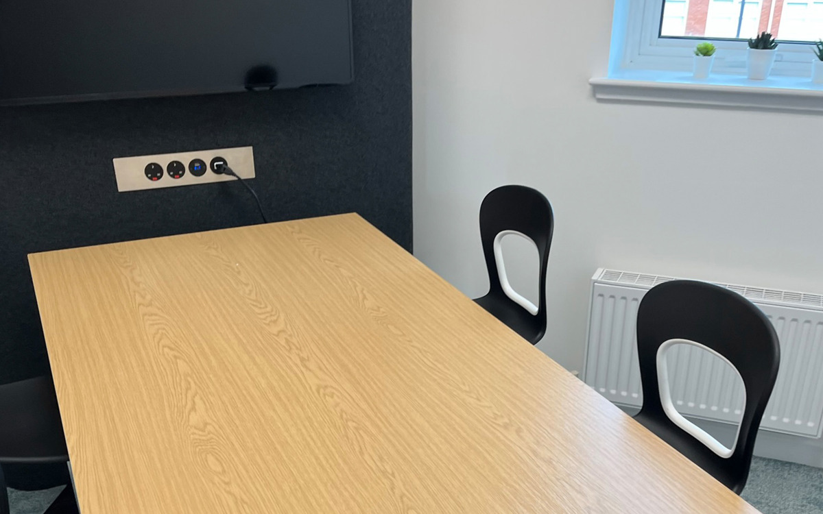 There’s a small personal meeting room as you enter the Partnership Hub with a motorised height adjustable desk and 32” TV accommodating up to 4 delegates.