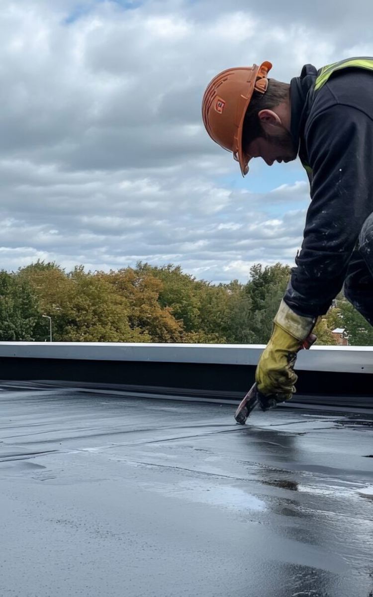 Works are grouped into five specialist areas: traditional flat roofing, liquid-applied systems, profiled metal, pitched roofing, and mixed roofing.